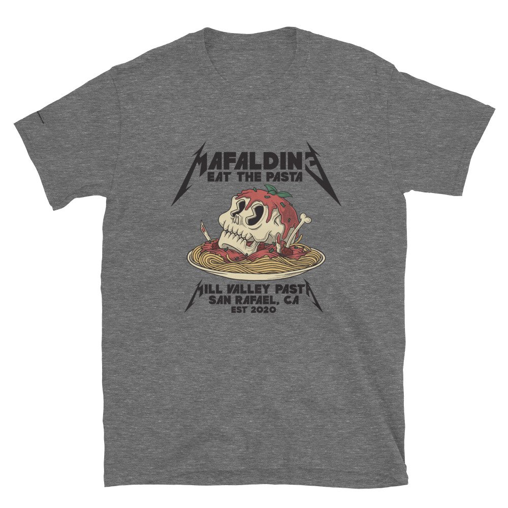 Look, maybe we love Rock 'n Roll, and maybe this shirt was inspired by a band also known for doing some work in San Rafael.. Metallica? Then again, it was absolutely not inspired by that band if we're gonna get sued for implying so. So, uh, we love pasta, and, uh, Mafaldine is our favorite shape. So we made this. Yah, that's our story.
